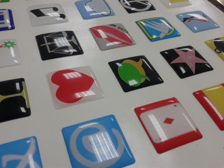 Pegatinas con gota de resina sobre vinilo blanco permamante, tirada conjunta de varios modelos