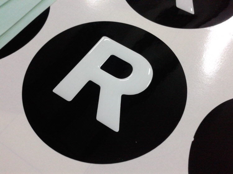 Pegatinas con gota de resina sobre vinilo blanco permamante braille fondo negro, letra en relieve para la identificación de contenedores