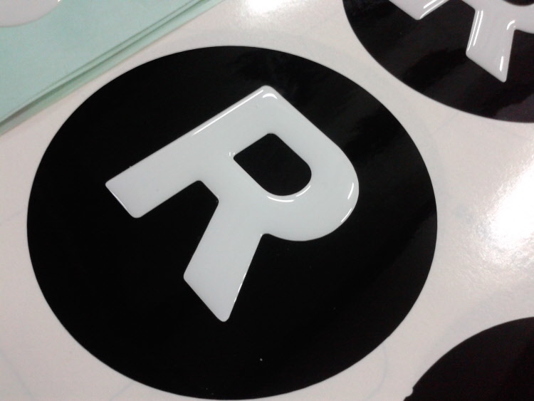 Pegatinas con gota de resina sobre vinilo blanco permamante con relieve para el marcaje de contenedores