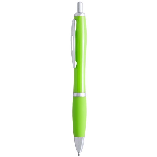 Bolígrafo de mecanismo pulsador de atrevido diseño bicolor con accesorios en color plateado y cuerpo de suave acabado en divertidos colores sólidos. Con original clip metálico troquelado a juego y cómoda empuñadura. Tinta azul.
